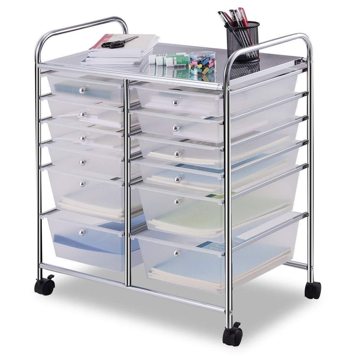 Do you want to have a storage cart that can be rolled smoothly from one place to another? Our 12-drawer rolling storage cart includes 4 bigger drawers and 8 smaller drawers, which provide enough storage space for you. Constructed of industrial-strength metal tubes and finished in chrome, the cart is sturdy enough to serve you for a long time. Equipped with easy-to-grab handles and 4 universal wheels, it is easy to move the lightweight cart. And 2 of the wheels have a simple lock for stopping easily. With our practical cart, you can store various things from art and office supplies to cleaning or kitchen essentials. It is Ideal to arrange your different stuff at the office, home, school garage or just about anywhere organization is needed.