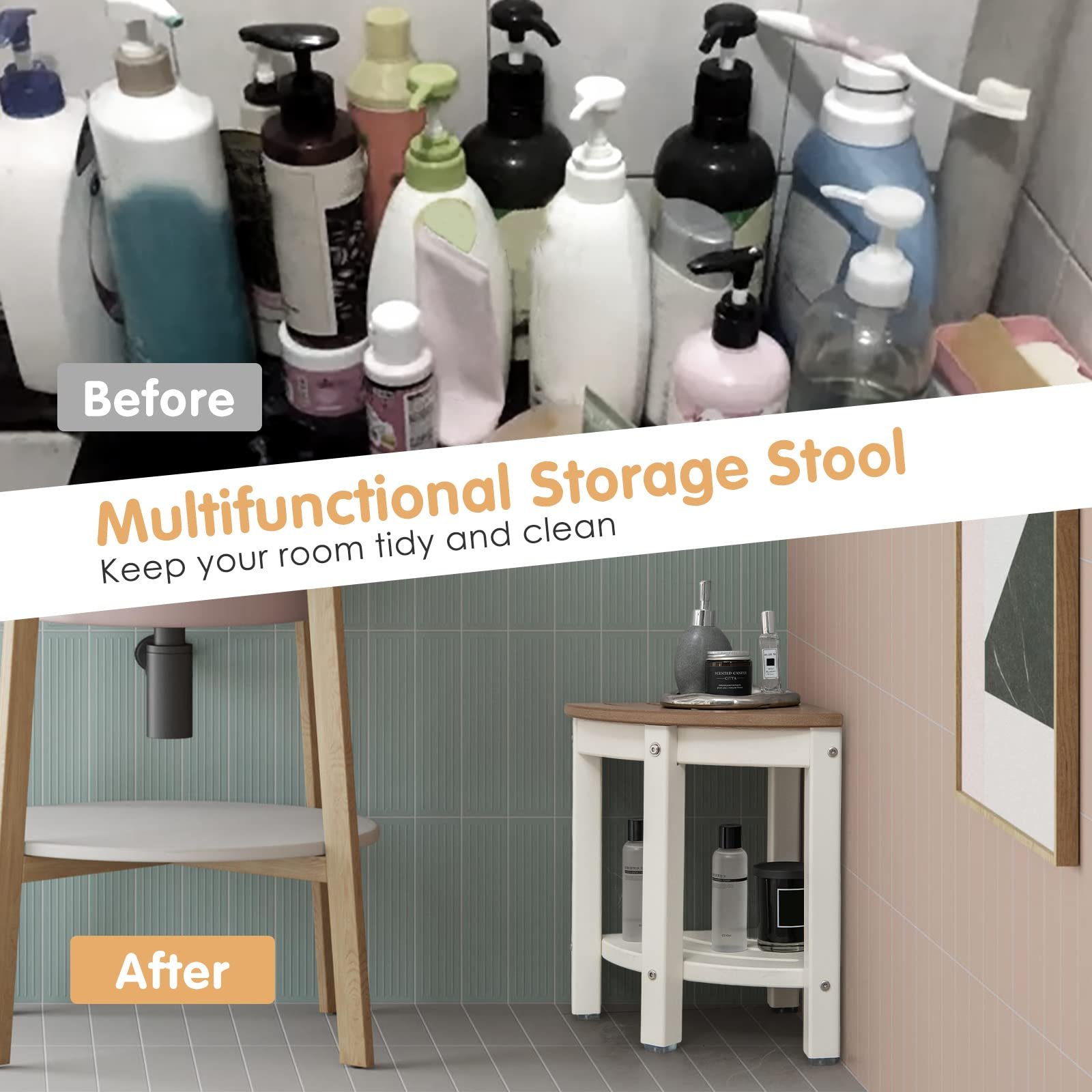 • Corner Shower Stool with Storage: The 90-degree design makes this bathroom footrest right for the corner of the toilet, bathroom, shower room, and more, which is perfect as a shaving stool or corner stool with a storage shelf for small spaces. The smooth and curved top is able to prevent collision and scratching.