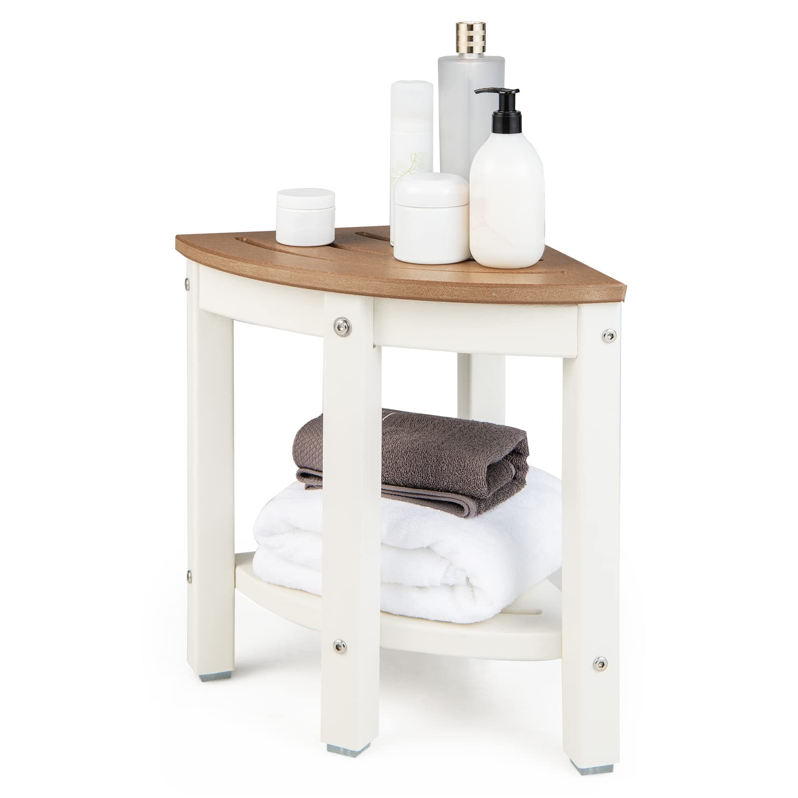 Giantex Corner Shower Stool Waterproof - HDPE Shower Bench Seat with Storage Shelf