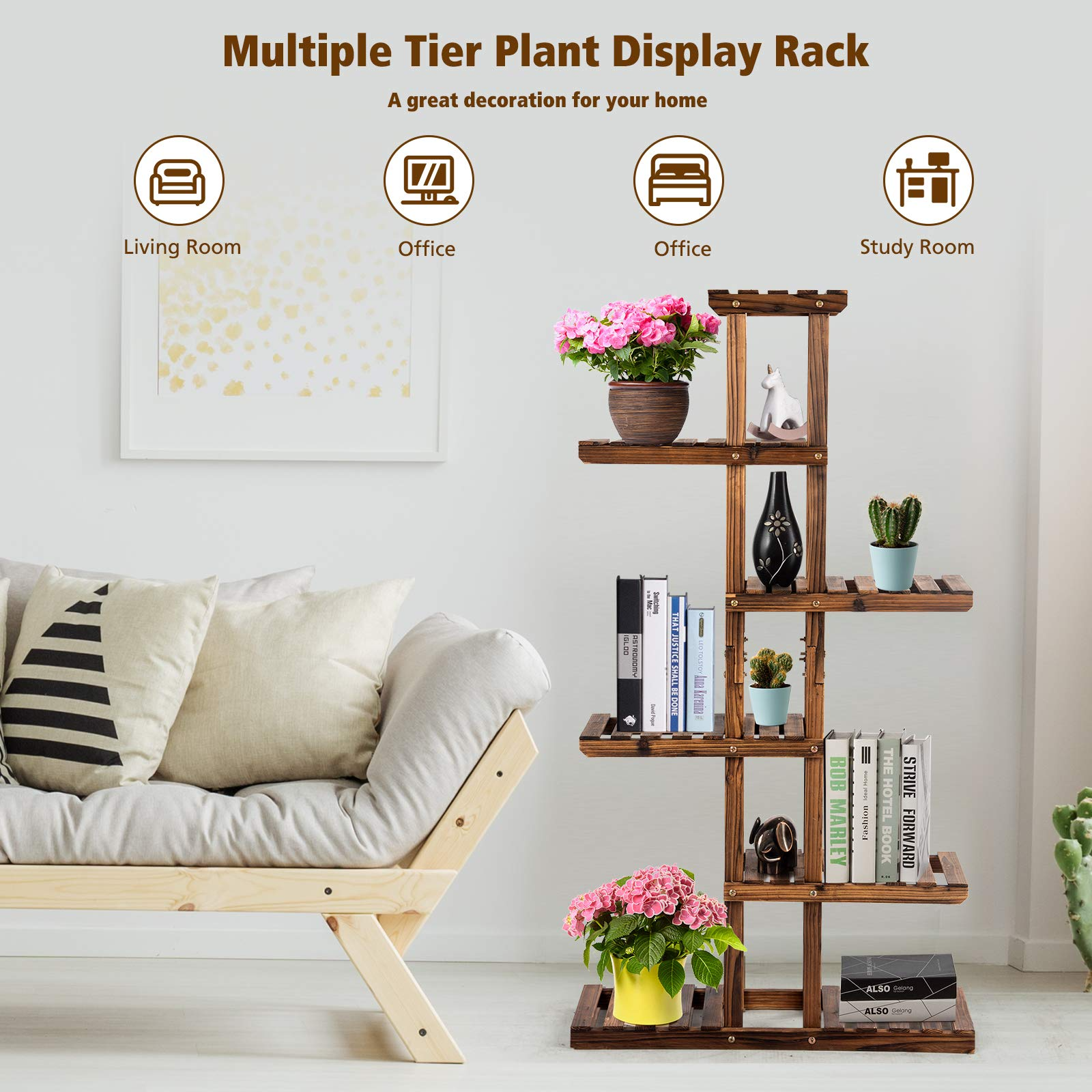 Our flower stand can fully play its multifunctional role inside or outside your home. Equipped with solid and weather-resistant wood construction, the plant stand can be placed at your balcony, living room, garden or patio etc. not only todisplay beautiful flowers and vigorous potted plant but also to store or exhibit your photos, trophies, books and other beautiful artworks. Multi-layer high and low design makes full of space to highlight all plants and makes them not affect with each other. Each rack provides sufficient space to accommodate plants, and hollow-out design make it convenient for you to water plants without messy. With strong bearing capacity, anti-corrosive and weather-resistant wood construction will maintain long term use. It will be an ideal choice for your home!