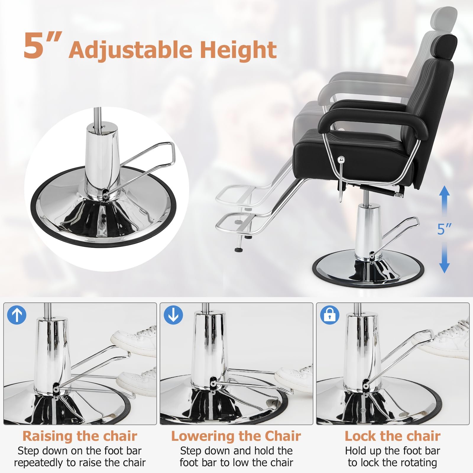 • Reclining Backrest & Adjustable Headrest: This barber chair features a 135° reclining backrest and an 8-position adjustable headrest, ensuring a comfortable posture for your clients. The seat height can be easily adjusted from 23”-28.5”, allowing barbers of different heights to provide excellent service to guests.